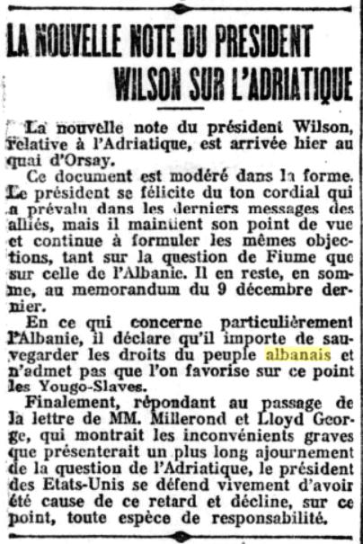 Le Petit Troyen (1920) – Presidenti Wilson, ministrisë së jashtme franceze: “Të mbrohen të drejtat e shqiptarëve! Nuk pranoj që Jugosllavët të favorizohen në kurriz të tyre!”