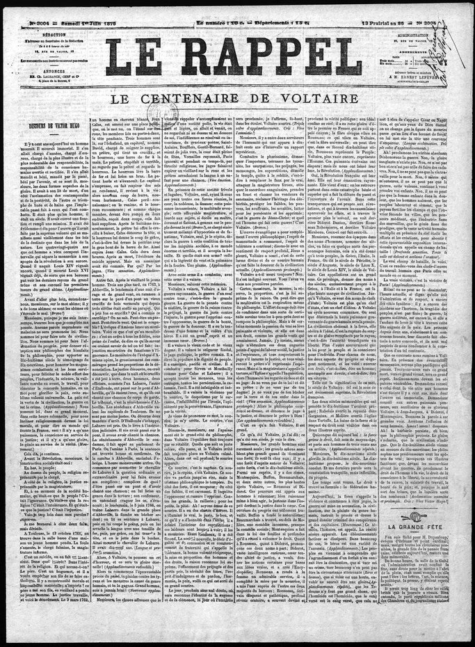 Le Rappel (1878)- Fjalimi historik i Victor Hugo me rastin e 100 vjetorit të ndarjes nga jeta të shkrimtarit dhe filozofit të shquar francez Voltaire