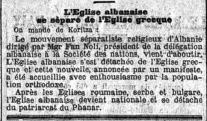 Le Temps (1921)- Kisha ortodokse shqiptare, me iniciativë të Fan Nolit, është shkëputur nga ajo greke