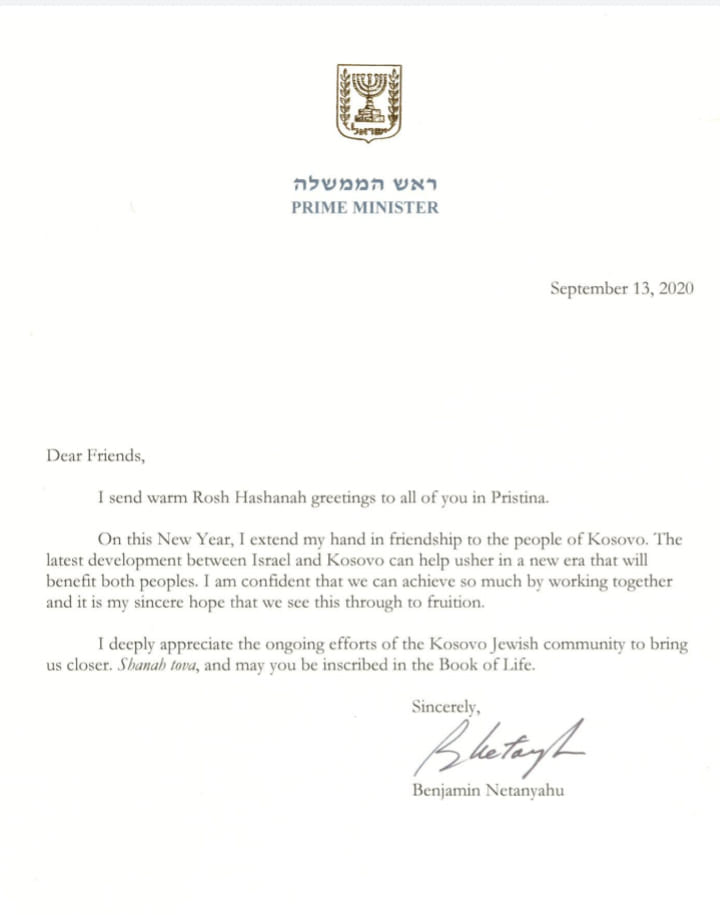 Letra e plotë e Kryeministrit të Izraelit, Benjamin Netanyahu: Në këtë Vit të Ri (hebraik), unë i shtrij dorën time të miqësisë popullit të Kosovës