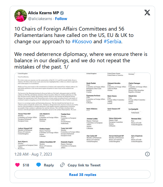 Deputetja britanike, Alicia Kearns, publikoi letrën që i është dërguar sekretarit amerikan të Shtetit, Antony Blinken, shefit të diplomacisë së BE-së, Josep Borrell, dhe sekretarit të Jashtëm britanik, James Cleverly. Ajo tha se kjo letër është nënshkruar nga dhjetë kryetarë të komiteteve për punë të jashtme dhe 56 deputetë.