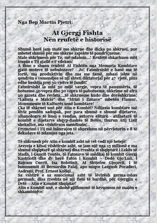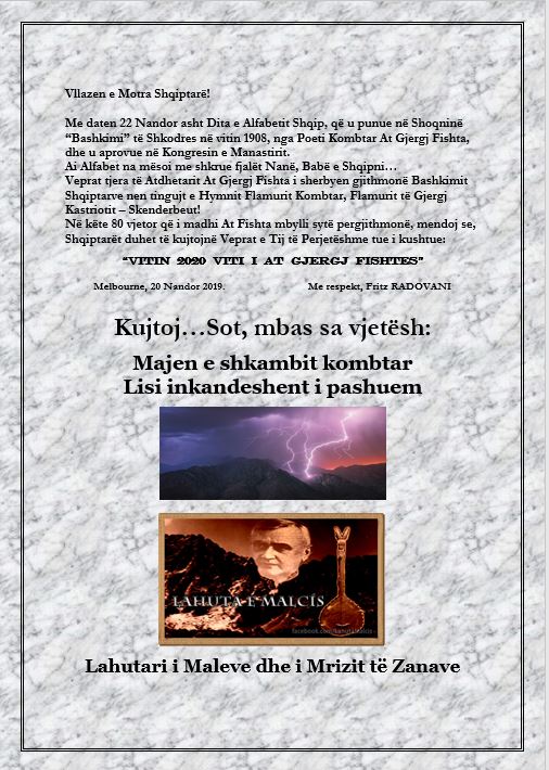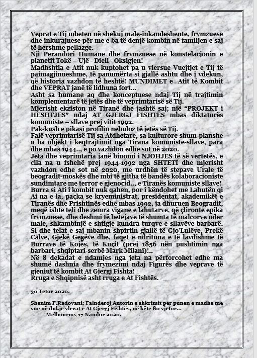 Falemnerës fort, i dashtun Zotni Fritz Radovani, qi më nxite, më lype disa shkrojla për Atin e Kombit, At Gjergj Fishtën me rastin e 8o vjetorit të Ndamjes nga jeta vetëm FIZIKISHT , për formulimin dhe për botimin pranë ksaj REDAKSIE ME ZA E ME SHQYPTARË SHUMË!