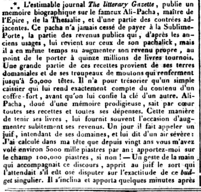 The litterary Gazette (1817)- Një shkrim biografik për të famshmin Ali Pashë Tepelena, njeriun me kujtesë të jashtëzakonshme