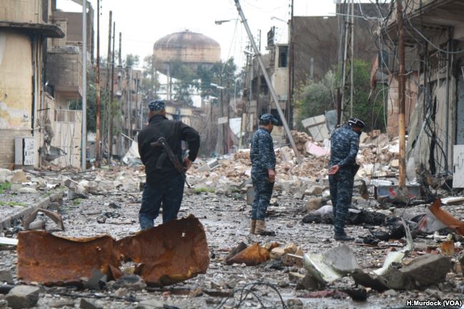 Iraqi Federal police tour a neighborhood shortly after a battle, still littered with rubble and bodies of militants in Mosul, Iraq on March 16, 2017.