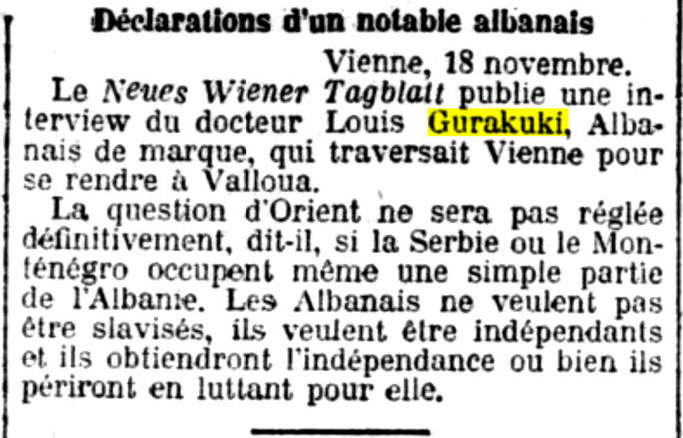 Luigj Gurakuqi për Neues Wiener Tagblatt (18 nëntor 1912) : “Shqiptarët do ta fitojnë pavarësinë ose do të vdesin duke luftuar për të.”