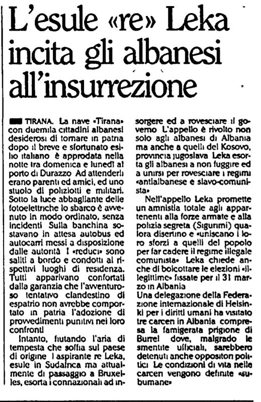 L’Unità (1991)- Leka Zogu I, shqiptarëve të Shqipërisë dhe të Kosovës: “Bashkohuni për të përmbysur regjimet antishqiptare dhe sllavo-komuniste!”