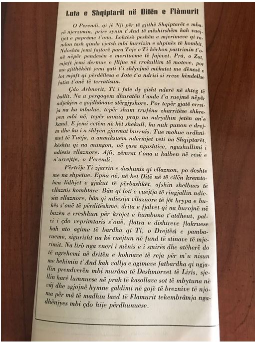 Në këtë mënyrë dhe në këtë ditë të lavdishme të historisë së Kombit shqiptar, ju që sot kini privilegjin dhe nderin të keni në duart tuaja frenat e fatit dhe të ardhmen e shqiptarëve, me një bashkëpunim më të ngusht politik dhe atdhetar — mbi interesat personale e partiake — do të nderonit Atdheun dhe të kujtonit lavdinë e atyre patriotëve që shpallën Pavarësinë e Kombit shqiptar më 28 Nëntor 1912. Me një bashkpunim të tillë politik, njëkohësisht, do të ringjallnit ndjesitë dhe shpresa të reja për një rilindje të vërtetë për mbarë Kombin shqiptar, si pjesë e asaj familjeje të madhe trako-ilire, që sipas At Gjergj Fishtës, ishte “në nam e në zë në historinë e fiseve dhe të kombeve”.