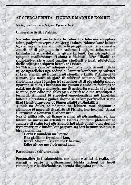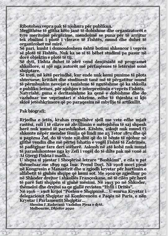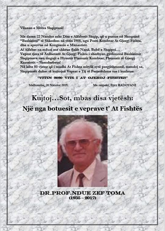 LX – 2020 VITI I AT GJERGJ FISHTËS – DR. PROF. NDUE ZEF TOMA: AT GJERGJ FISHTA – FIGURË E MADHE E KOMBIT – Përgatiti për botim Fritz RADOVANI
