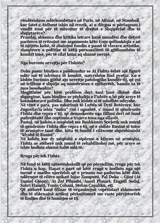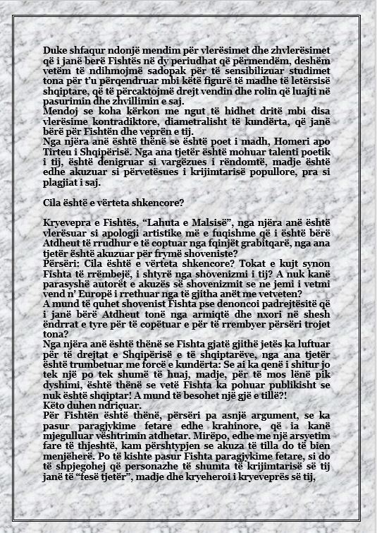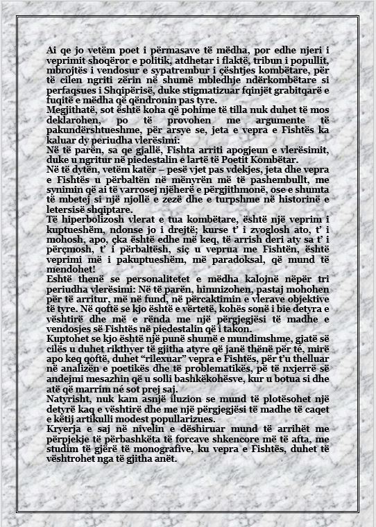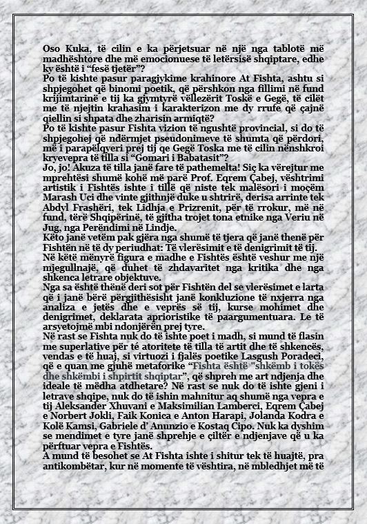 Ai bëri një pushim, si të donte të gjente përgjigjen më të mirë për pyetjen, dhe në fund shkundi shpatullat si nga njё lehtёsim nga njё peshё e rёndё dhe më tha: