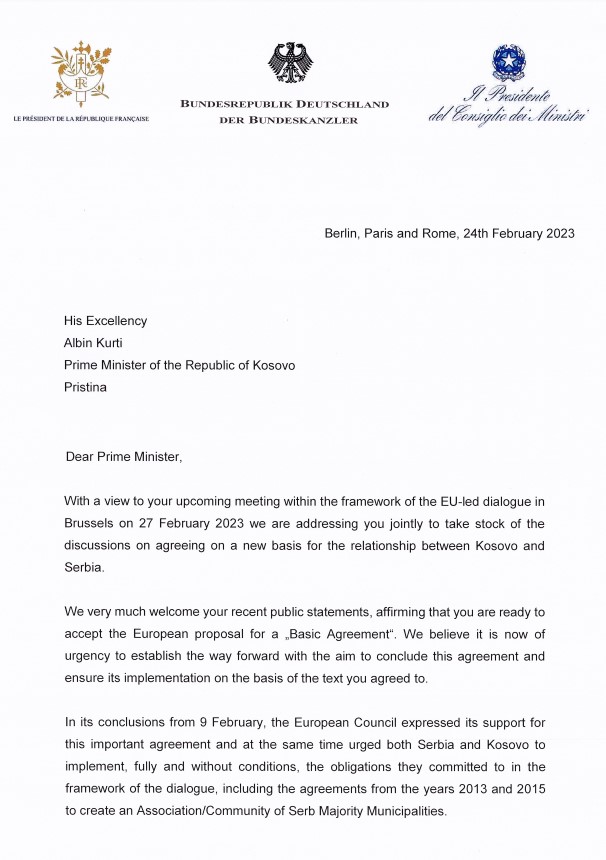 Një ditë para këtij takimi, Kurti ka pranuar një letër të përbashkët nga presidenti i Francës, Emmanuel Macron, Kancelari i Gjermanisë, Olaf Scholz dhe kryeministrja e Italisë, Giorgia Meloni në lidhje me takimin e nesërm në Bruksel dhe propozimin Evropian. Siç njofton Zyra e Kryeministrit në këtë letër ata kanë mirëpritur deklarimet publike të kryeministrit Kurti sa i përket propozimit Evropian.