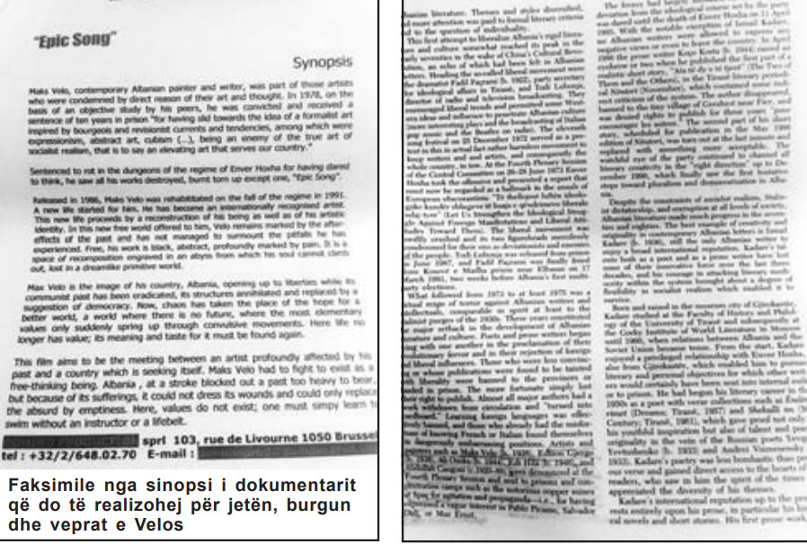 Një tjetër peng i Velos është bashkëpunimi i lënë përgjysmë me producentin belg, Sergio Ghizzardi, me të cilin prej vitit 2001 ishin duke punuar për të realizuar një dokumentar për jetën, burgun e veprat e artistit. Velo ruan ende sinopsin e skenarit, materiale të tjera që do ndihmonin për realizimin, si dhe bisedat me producentin. “Puna nuk nisi nga realizimi se ndërhyri Kryeministri Rama e unë menjëherë hoqa dorë”, rrëfen Velo. Sakaq, dokumentari do të vijonte edhe me Edi Hilën dhe Kryeministrin Rama, e në këtë pikë Velo refuzon të vazhdojë bashkëpunimin me Ghizzardin. “S’mund të bashkëpunoja me Hilën, se ai s’ka qenë i burgosur politik”, thotë Velo, duke theksuar se Rama dhe Hila duhet të mbajnë përgjegjësi për falsifikimin që bënë. Një fakt tjetër që piktori sjell në vëmendje është përmendja e Hilës mes të burgosurve në botimin “World literature” të albanologut të ndjerë Robert Elsie. Informacion i rremë, njësoj si shkaqet e bëra publike në lidhje me riedukimin e Hilës, sipas Velos. “Nuk luhet me burgun”, thotë arkitekti. Për më tepër atë të diktaturës, që ai e provoi në lëkurë. Sprovat çnjerëzore përndoqën edhe familjarët e tij. Vdekja e të atit mjek, përjashtimi nga puna i të vëllait, tronditjet që shpunë të motrën në spitalin psikiatrik, janë një peshë e rëndë. “Pastaj më dogjën edhe veprat! Në asnjë diktaturë nuk i janë djegur veprat artistit, por mua më ndodhi edhe kjo. Ku ka vuajtje më të madhe për një artist?!” – thotë arkitekti. Për këto arsye, edhe siç rrëfen, “në emër të rezistencës intelektuale, që iu kundërvu ideologjisë mashtruese komuniste”, ai vendosi që të thyejë heshtjen dhe të tregojë mashtrimet, që sipas tij janë bërë mbi plagët që la diktatura më e ashpër staliniste.
