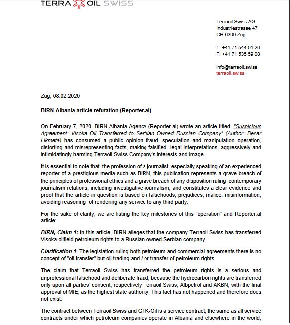 Në mbështetje të parimeve të transparencës dhe të drejtës për t’u mbrojur dhe përgjigjur ndaj akuzave të publikuara nga media juaj, kërkojmë përgënjeshtrimin e shkrimit dhe të drejtën tonë për t’u botuar nga ana juaj në të njëjtin vend reagimi i kompanisë Terraoil Swiss.