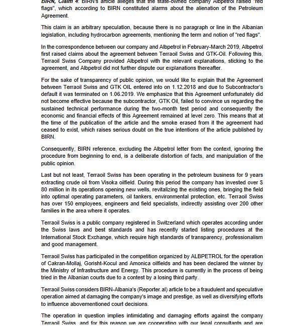 Kompania Terraoil Swiss e konsideron shkrimin e BIRN-Albania (Reporter.al) si një operacion të bazuar mbi mashtrim dhe spekulim, me qëllim dëmtimin e imazhit dhe prestigjit të kompanisë, si dhe një përpjekje diversive për të ndikuar mbi vendimin e gjykatave përsa më lart.