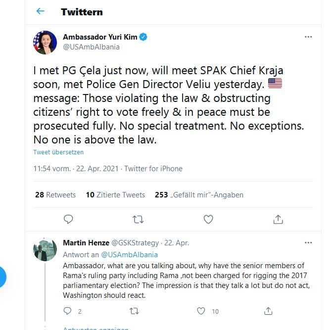 Këshilltari i CDU-së ne Gjermani Martin Henze i ka replikuar ambasadores amerikane në Shqipëri Yuri Kim pas Twitter-it të kësaj të fundit për takimin me Kryeprokuroprin e Përgjithshëm Olsian Cela.
