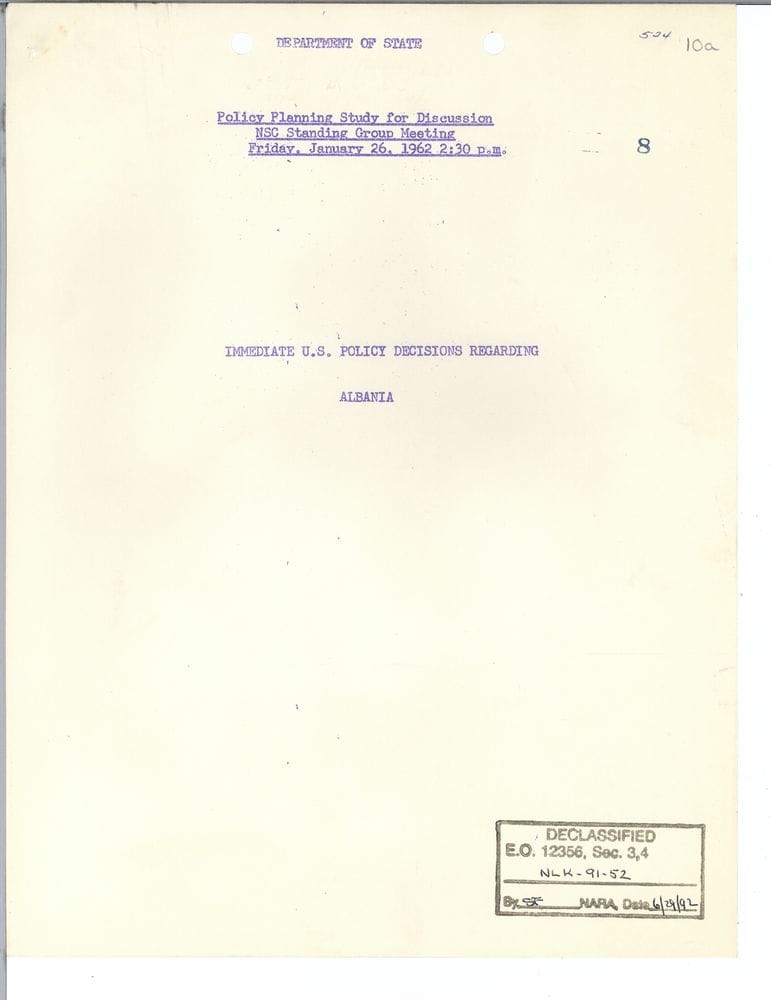 Duke marrë parasysh interesin e politikës, mbi zhvillimet shqiptare që përfshijnë dallimet e Shqipërisë, me pjesën tjetër të bllokut komunist në Europë, Departamenti ka përgatitur kohët e fundit një studim planifikimi, të titulluar: “Vendime të menjëhershme të politikës së SHBA-së në lidhje me Shqipërinë.”
