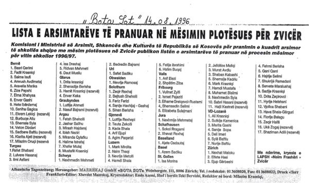 Nëpërmjet një konkursi të rregullt të shpallur nga Ministria e Arsimit, Shkencës dhe Kulturës e Republikës së Kosovës,të datës 10 gusht 1996,të gjithë mësimdhënësit e shkollës me mësim plotësues në Gjuhën shqipe në Zvicër, përzgjidhen me kualifikime përkatëse.