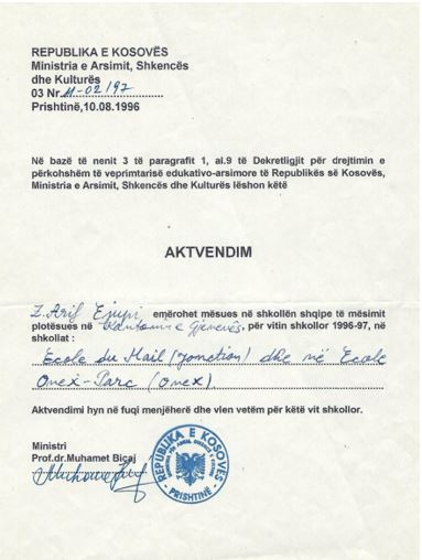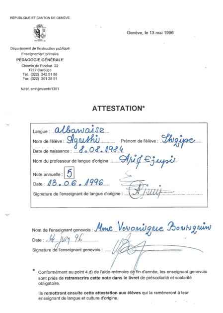 Këtë e dëshmon edhe ky vërtetim i nxënëses Shqipe Agushi,ku shihet bartja e notës nga Mësimi Plotësues i Gjuhës shqipe,në atë të rregullt në Gjuhën frënge.