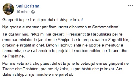 Mosdekretimi i Cakajt, Berisha: Goditje e merituar për flamurtarët albanofobë të Serbomadhisë