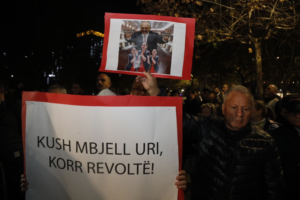 “Nëse dikush në fshat ndërton një mur pa leje shkon në burg, por nëse t’i vjedh popullin më të varfër në Evropë, jo vetëm nuk shkon në burg, por edhe mbrohesh nga numri 1 i pushtetit”, u dëgjua të thoshte një nga protestuesit.