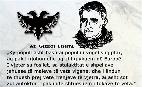 “…E mirë pra, Zotnij të nderuem, ky asht bash ai populli i vogël Shqiptar, aq pak i njohun dhe aq zi i gjykuem në Europë! I vjetër sa fosilet, sa stalagtitat e shpellave jehuese të maleve të veta vigane, e le të thuesh prej vetë bucave të Shqipnisë, ai asht sot zot autokton e i pakundershtueshëm i tokave të veta. Ende sllavi nuk kishte dalë prej bjeshtës së thellë t’ Uralit e ende s’ ishte ngjizun e sotmja frotë laramane neohelenike, kur Shqiptari korrte me zagna, fushat e pafund të Ballkanit. Qe kështu, Shqiptari e kishte mbyllë nji periudhë të gjatë të historisë së vet në moshën e rruzullimit. “Na thoni, kush para Shqiptarit, i ngau qetë sinorëve të Ballkanit?”. Ka qenë pyetja e At Gjergj Fishtës.