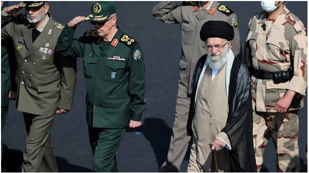 Ayatollah Khamenei, Udhëheqësi Suprem aktual i Iranit, këtu i rrethuar nga personalitete të larta të forcave të armatosura