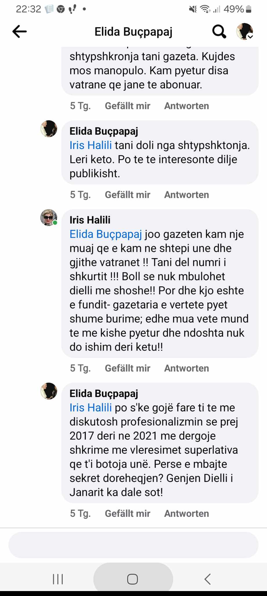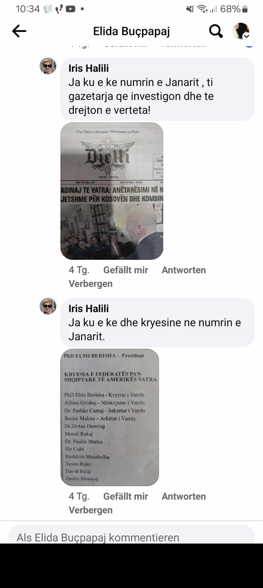 Dhe jo vetëm kaq, por zonja në fjalë, që pretendon se ka dhënë dorëheqjen nga kryesia e Vatrës në nëntor, por që në gazetën Dielli të dhjetorit dalë në janar rezultonte të ishte në kryesi, në mënyrë publike postoi në murin tim të Facebook-ut ku unë kisha botuar opinionin, screenshote nga numri i janarit të Diellit, që, sikur e nxorëm në spikamë, zonja në fjalë pretendon se e ka në shtëpi që prej një muaji!