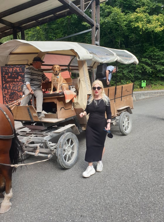 Këtë udhëtim e bëri më të këndshëm e dëfryes karrocieri ynë Ivo, me dy kuajt e tij Haarle e Niçe dhe me qenushen e tij Kira. Kira e çlodh Ivon me përkëdheljet e saj të pakursyera, por është miqësore edhe me vizitorët, i pranon përkëdheljet e tyre. Haarle dhe Niçe mërziten kur Ivo e ngadalëson ritmin e udhëtimit me kërkesën e guidës që na jep ne shpjegimet e rastit. Atyre iu jep kënaqësi vrapimi, ndoshta edhe i kënaq troku i patkojve mbi asfalt. Niçe e grind Haarlen, sidomos kur ndalojnë për të pirë ujë, për t’u furnizuar me karburant siç thotë karrocieri Ivo.