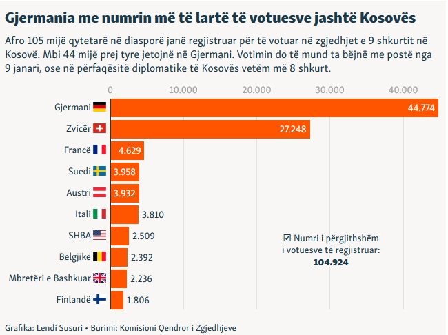 Ndërkaq, nga 9 janari e deri më 8 shkurt, mërgata ka mundur të votojë edhe përmes postës. KQZ ka njoftuar më herët se 104.934 votues janë regjistruar për të votuar jashtë Kosovës dhe 84.525 prej tyre zgjodhën që të votonin përmes postës.