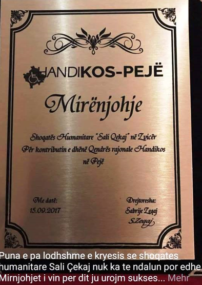 Jakup Gashi, Zyrtar i Lartë në Drejtorinë e Kulturës, Rinisë dhe Sportit në Komunën e Podujevës, i ndau Bedri Muçollit mirënjohje për kontributin e tij në futbollin kosovar.