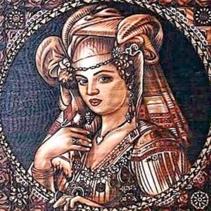 « Ripikturim i tablosë së që Paul-Emile Jacobs-i* (1802-1866) pikturoi në Romë më 1840 për “Vila Wilhelmina” të mbretit  të Würtemberg-ut, në krye të herës, kjo pikturë titullohej « Shehrazada që i tregon një histori kalifit » , në përshtatje me frymën orientaliste të Wilhelmina-s. Vepra është realizuar gjatë periudhës kur Jacobs-i trajtoi tema nga Greqia. Me shumë gjasa, ajo paraqet Kira Vassiliki (Zonjën Vasiliqi, 1789-1834) dhe Ali Pashën (1740-1822). Ky kompozim është bërë një nga veprat emblematike të Jacobs-it, shumë e përhapur me anë të litografisë së Franz Hanfstaengel-it adh C. Ficher-it dhe ka frymëzuar gjithashtu vizatimin Ali Pasha  dhe Kira Vassiliki të Theodoros Vryzakis-it. Kjo tablo paraqet një çast intim, ku ndihet dhembshuria dhe dashuria. Kira, e bija e Kitzos  Kontaxis-t, hyri shumë e re në haremin e Ali Pashës. Falë bukurisë dhe ndershmërisë së saj, ajo fitoi dashurinë dhe favoret e sovranit. Këtë gjë, ajo e shfrytëzoi për t’ua shpëtuar jetën një numri të madh të bashkatdhetarëve të saj.
