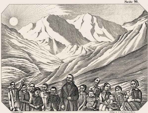 Mjeku Johann Jakob Guggenbühl me pacientët e tij dhe, në të djathtë, dhjakonja Ernestine Jaquet, asistentja e tij në klinikën Abendberg; litografi sipas një fotografie të Carl Durheim, nga vepra Die Heilung und Verhütung des Cretinismus und ihre neuesten Fortschritte, botuar në Bernë më 1853 (Biblioteka Kombëtare Zvicerane).