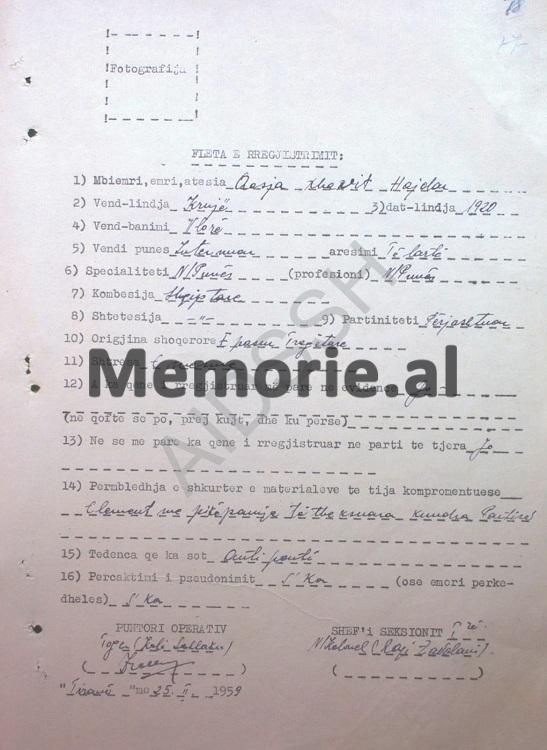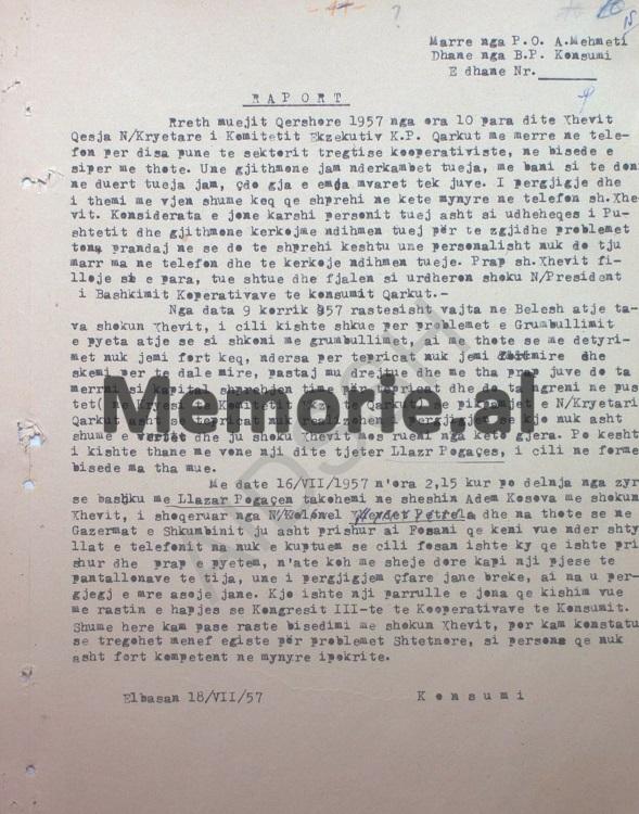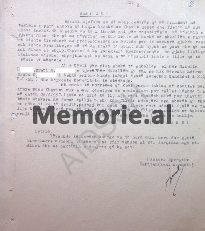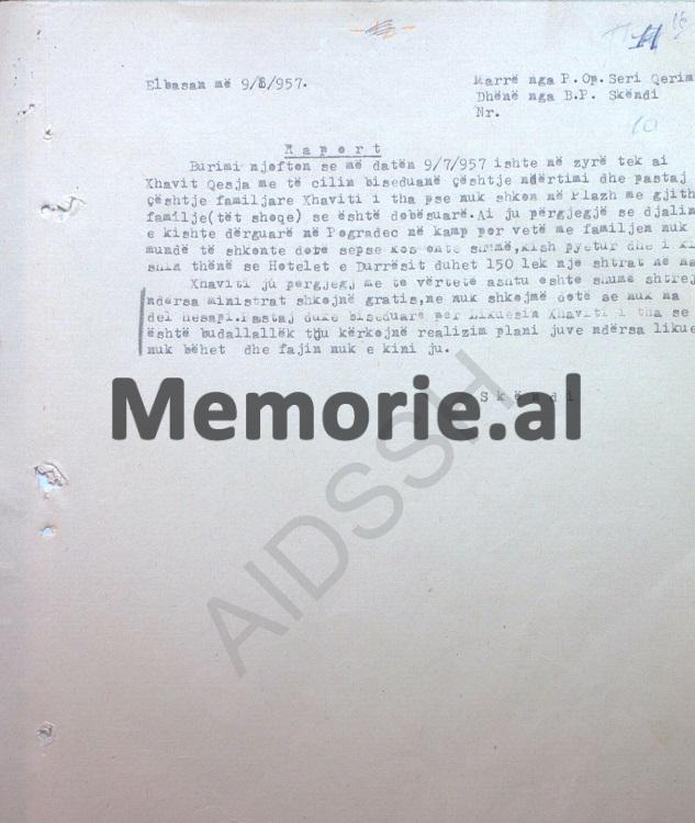 Për periudhën 1 janar 1955, 30 mars 1957, t’i thuhet se shpërblimi i caktuar nuk i jepet, për arsye se nuk ka vepruar sipas udhëzimeve tona, dhe si konsekuencë ka shkëputur lidhjet me zbulimet e huaja dhe nuk ka treguar interesim për zbatimin e detyrave të ngarkuara.