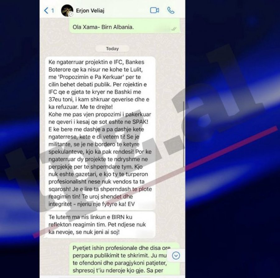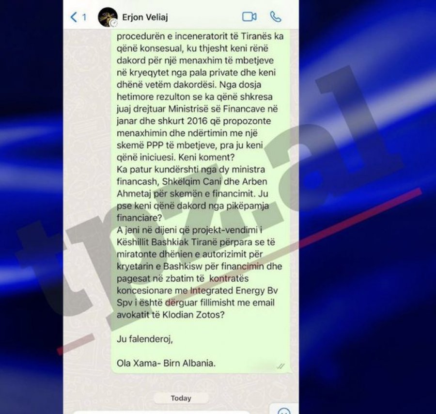 Më poshtë shkëmbimi në Whatsapp mes kryetarit të Bashkisë së Tiranës, Erion Veliaj dhe gazetares Ola Xama.