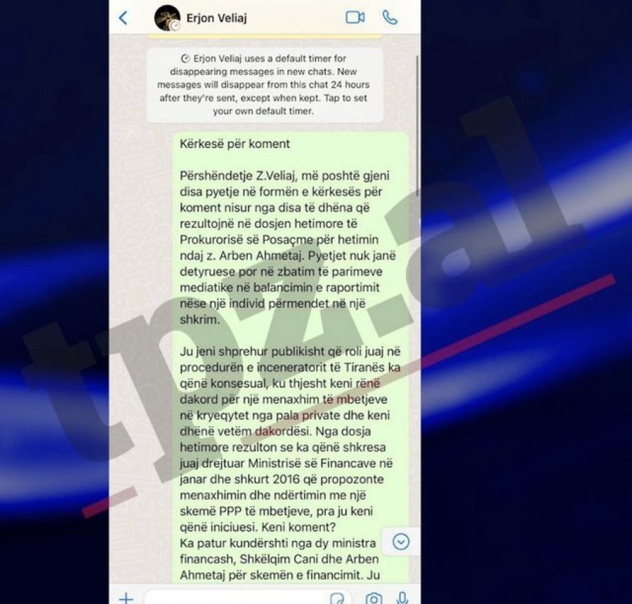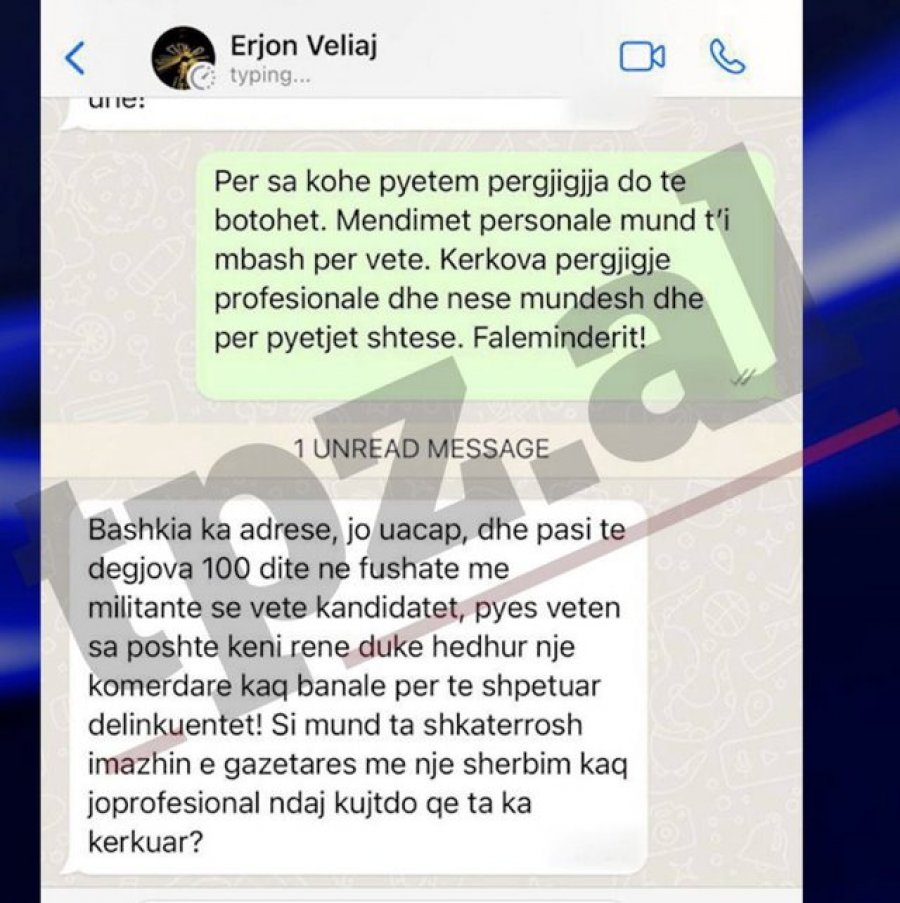 “Fillimisht e kam kontaktuar unë zotin Veliaj dhe i kam dërguar pyetje për shkrimin që po bëja. Ai është vënë në dijeni. Kemi pritur që të kthejë përgjigje. Unë I them që pyetjet nuk janë detyruese, nuk është kërkesë për informacion, por kërkesë për koment. E kemi pritur disa orë dhe nuk ka kthyer përgjigje. Ditën e nesërme më ka kontaktuar VEliaj me mesazhe fyese dhe ton vulgar.