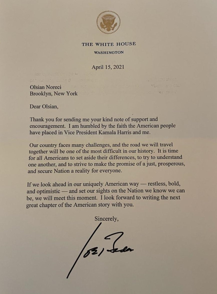OLSIAN NORECI- STUDENTI SHQIPTAR NË LETËRKËMBIM ME PRESIDENTIN AMERIKAN JOE BIDEN – Nga DALIP GRECA, Dielli
