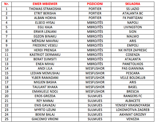 Panuçi shpall listën e futbollistëve me Jordaninë dhe Izraelin