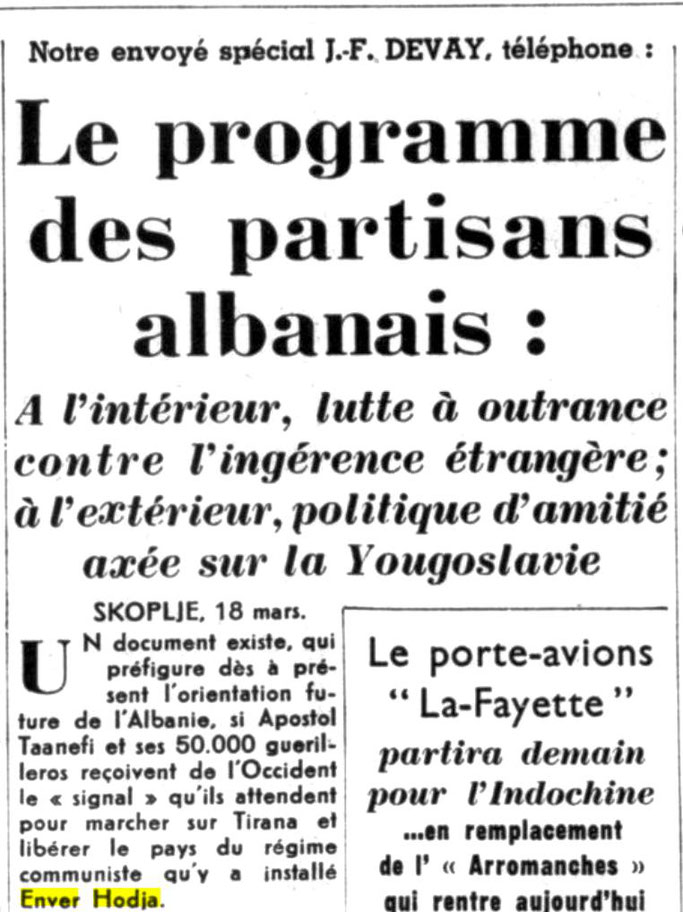 Paris-presse (1953) – Ky është manifesti dhe programi i partizanëve shqiptarë të Apostol Tanefit me qendër në Prishtinë për të rrëzuar Enver Hoxhën
