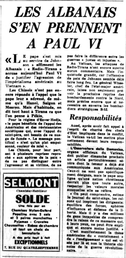 Paris-presse (1966)- Enver Hoxha, nëpërmjet Radio-Tiranës, sulmon papa Palin VI, të cilin e akuzon se mbështet luftën e amerikanëve në Vietnam