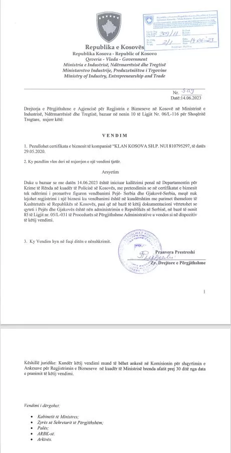 “Mbështetur në aktet ligjore, Ministria e Industrisë, Ndërmarrësisë dhe Tregtisë, përkatësisht Agjencia për Regjistrimin e Bizneseve e Kosovës, gjithashtu ka marrë vendim që të pezulloj certifikatën e biznesit të Shoqërisë Tregtare “KLAN KOSOVA” SHPK, deri në një vendim tjetër. Për vendimin e ARBK-së, është ftuar në takim dhe është njoftuar pala, përkatësisht pronari i Shoqërisë Tregtare “KLAN KOSOVA” SHPK.