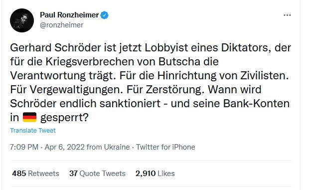 Paul Ronzheimer, Zv kryeredaktor i BILD: Kur do të sanksionohet Gerhard Schröder lobisti i një diktatori përgjegjës për krimet e luftës në Bucha!