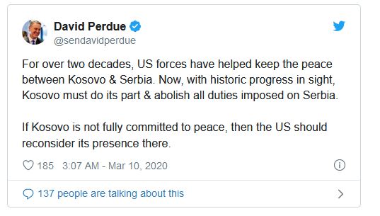Perdue: SHBA-ja duhet të rishqyrtojë praninë e saj në Kosovë nëse nuk hiqet tarifa