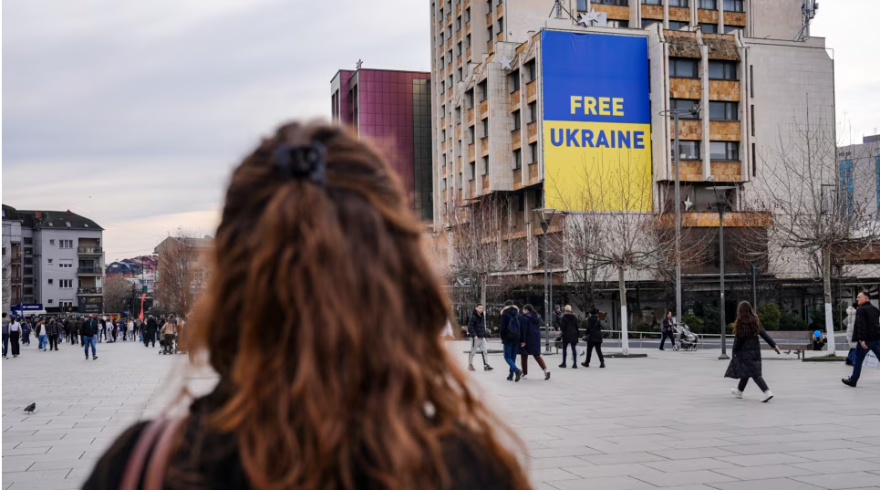 Në qendër të Prishtinës shihet një poster me mbishkrimin “Liri për Ukrainën”.