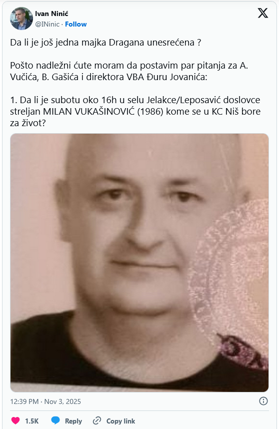 Fillimisht, edhe avokati serb, Ivan Niniq, shkroi në rrjetin social X se Millan Vukashinoviq ishte plagosur rëndë në një shkëmbim zjarri në fshatin Jellakcë pranë Leposaviqit dhe se mjekët po luftojnë për jetën e tij në Qendrën Klinike Universitare në Nish.