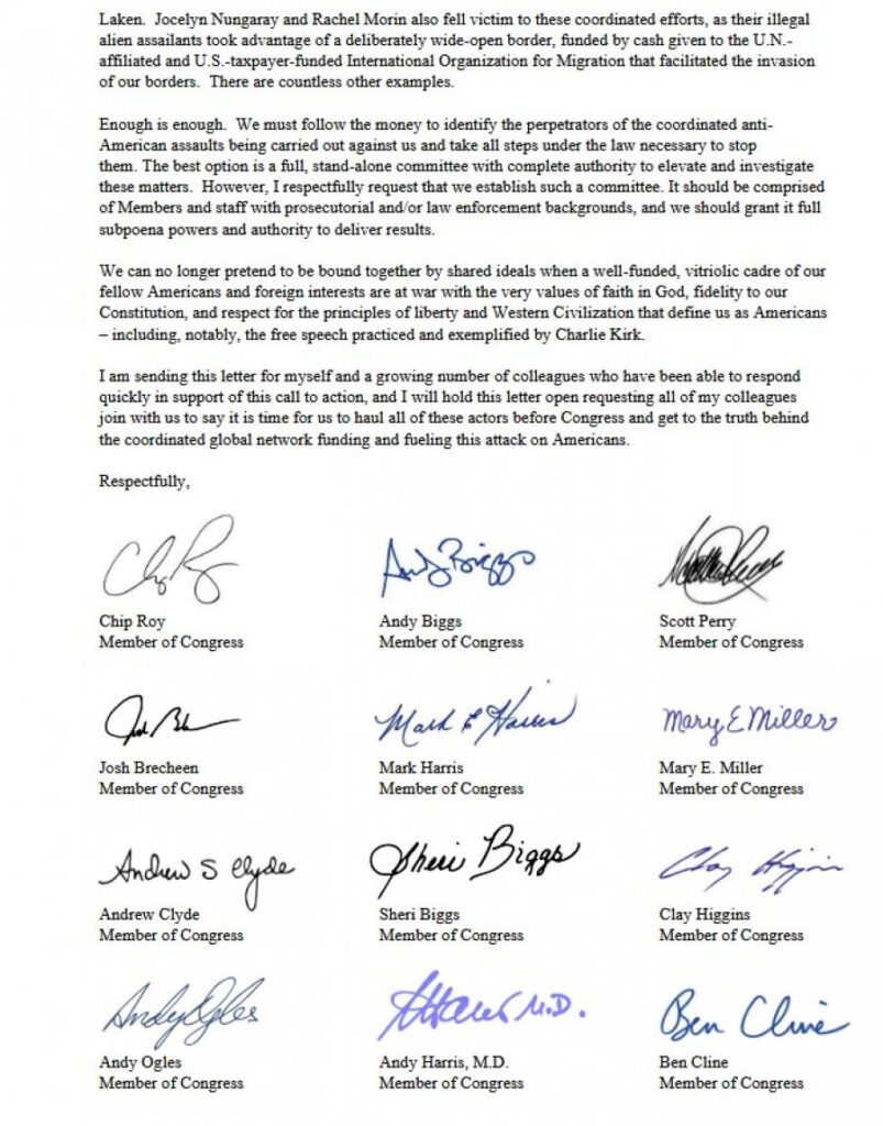 Përfaqësuesi Chip Roy, republikan nga Teksasi, po kërkon ngritjen e një komisioni të posaçëm në Dhomën e Përfaqësuesve për të hetuar “paratë, ndikimin dhe pushtetin pas sulmit të së majtës radikale ndaj Amerikës dhe sundimit të ligjit”, duke përdorur fuqi të plotë për thirrje dëshmitarësh (subpoena), pas vrasjes së themeluesit të Turning Point USA, Charlie Kirk.