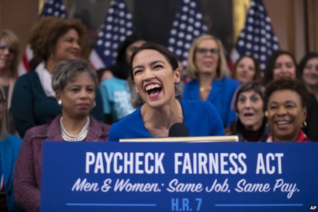 Rep. Alexandria Ocasio-Cortez, D-N.Y., smiles as she speaks at an event to advocate for the Paycheck Fairness Act on the 10th anniversary of President Barack Obama signing the Lilly Ledbetter Fair Pay Act.