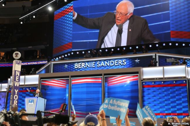 FILE – Former Democratic Presidential candidate Sen. Bernie Sanders takes the stage during the first day of the Democratic National Convention in Philadelphia, July 25, 2016.