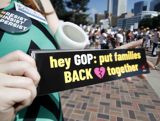 FILE – Samantha Montgomery of Denver holds up a sign during an immigration rally and protest in Civic Center Park Saturday, June 30, 2018, in downtown Denver.