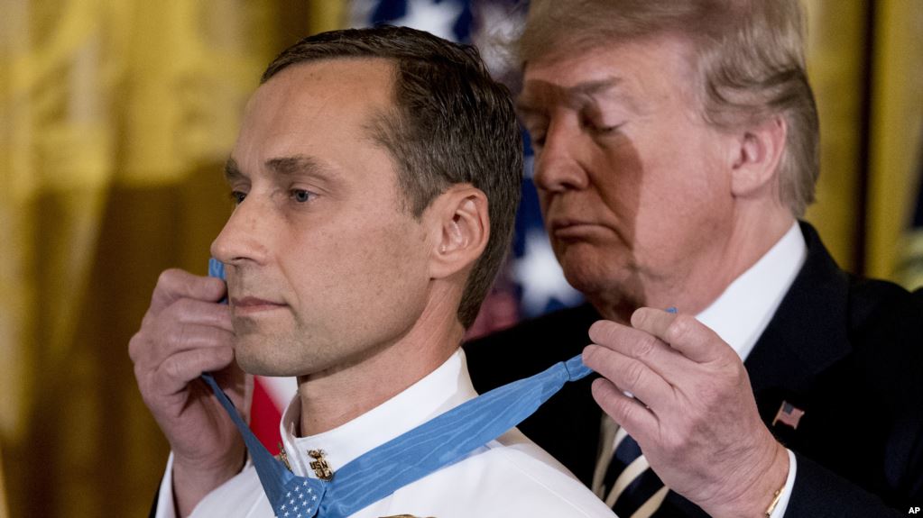 Presidenti Donald Trump i ka dhënë nderimin më të lartë ushtarak pjesëtarit të një ekipi elitë të marinës ushtarake amerikane për aktet heroike në vitin 2002 për të shpëtuar një tjetër pjesëtar të ekipit. Duke e nderuar Specialistin Britt Slabinski, Presidenti Trump tha se akti i tij i vetëmohimit në ndihmë të një bashkëluftëtari dëshmon shpirtin e patriotëve amerikanë.
