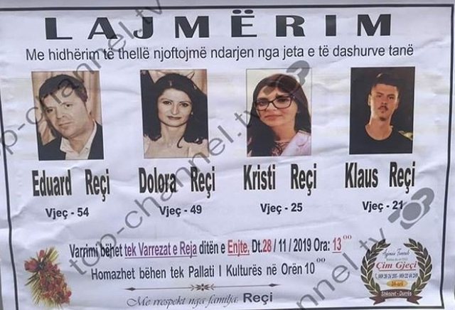 Babai Eduard Reçi, 54 vjeç, nëna Dolora Reçi, 49 vjeç, vajza Kristi Reçi, 25 vjeç, dhe djali Klaus Reçi, 21 vjeç u përcollën për në banesën e fundit. Një njoftim që të rrënqeth.