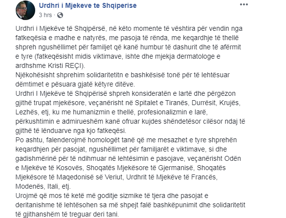 “Shpresojmë që ky evolucion të vazhdojë edhe në vijim, kështu njerëzit mund të pushojnë pak pas tërmetit. Shprehim ngushëllimet tona për familjet dhe personat e prekur. Qëndroni të sigurt!